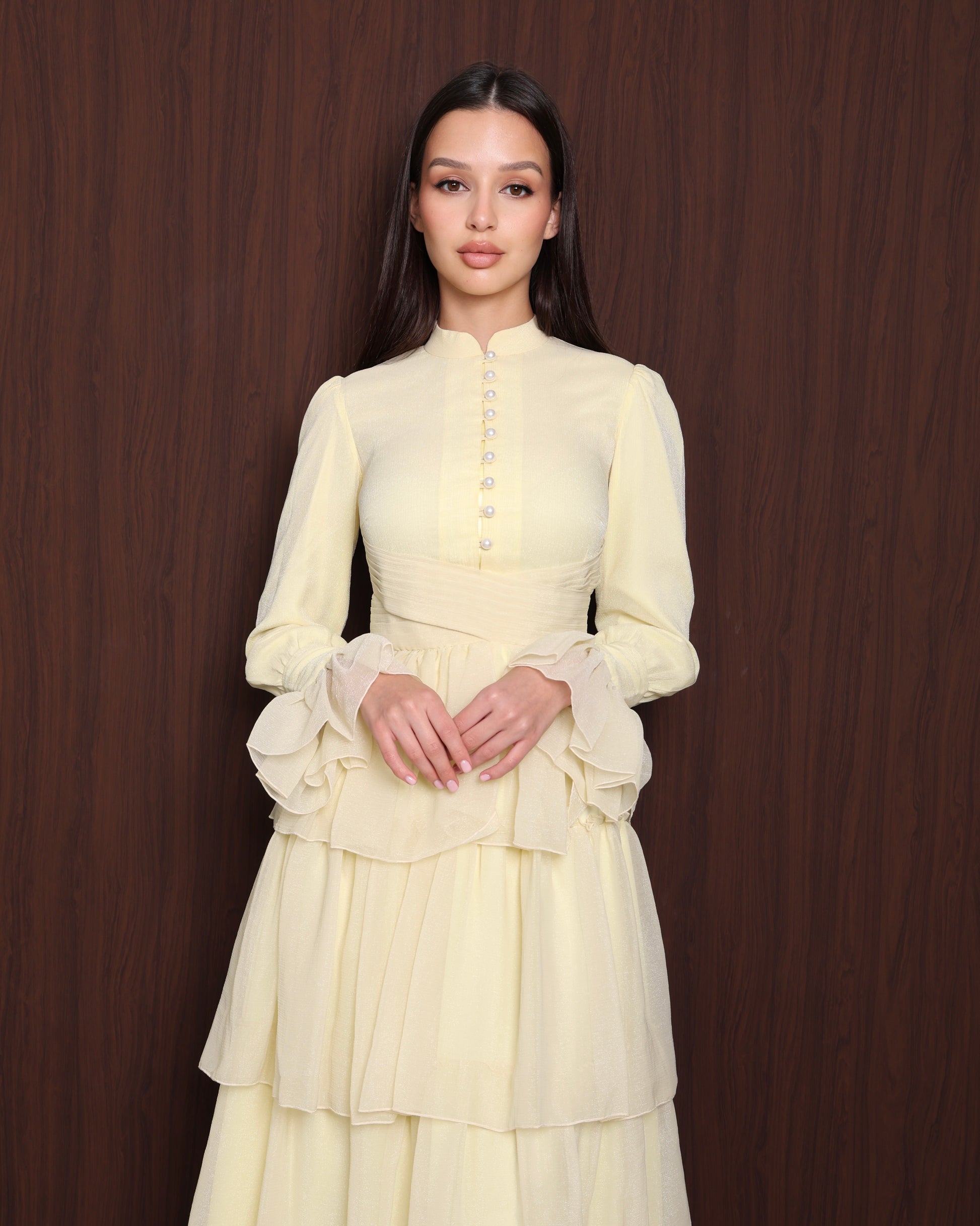 The fitted bodice features soft tailoring and pearl button details, bringing subtle elegance and elevated charm. The soft butter-yellow tone enhances the gown’s graceful aesthetic, making it ideal for both daytime and evening celebrations.